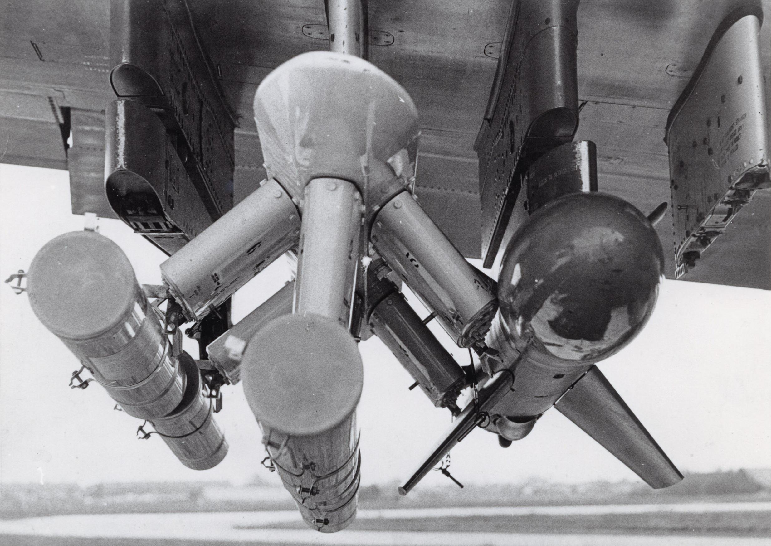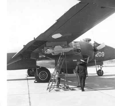 Raket en parachutefakkels onder de vleugel van een MLD-Neptune-patrouillevliegtu?
