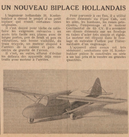 here is a two-seat shoulder-wing light Dutch Airplane,maybe remained a Project,designed by Mr. Koekebakker in 1949,powered by one 65 hp Continental Pusher engine,does anyone hear about it before ?.