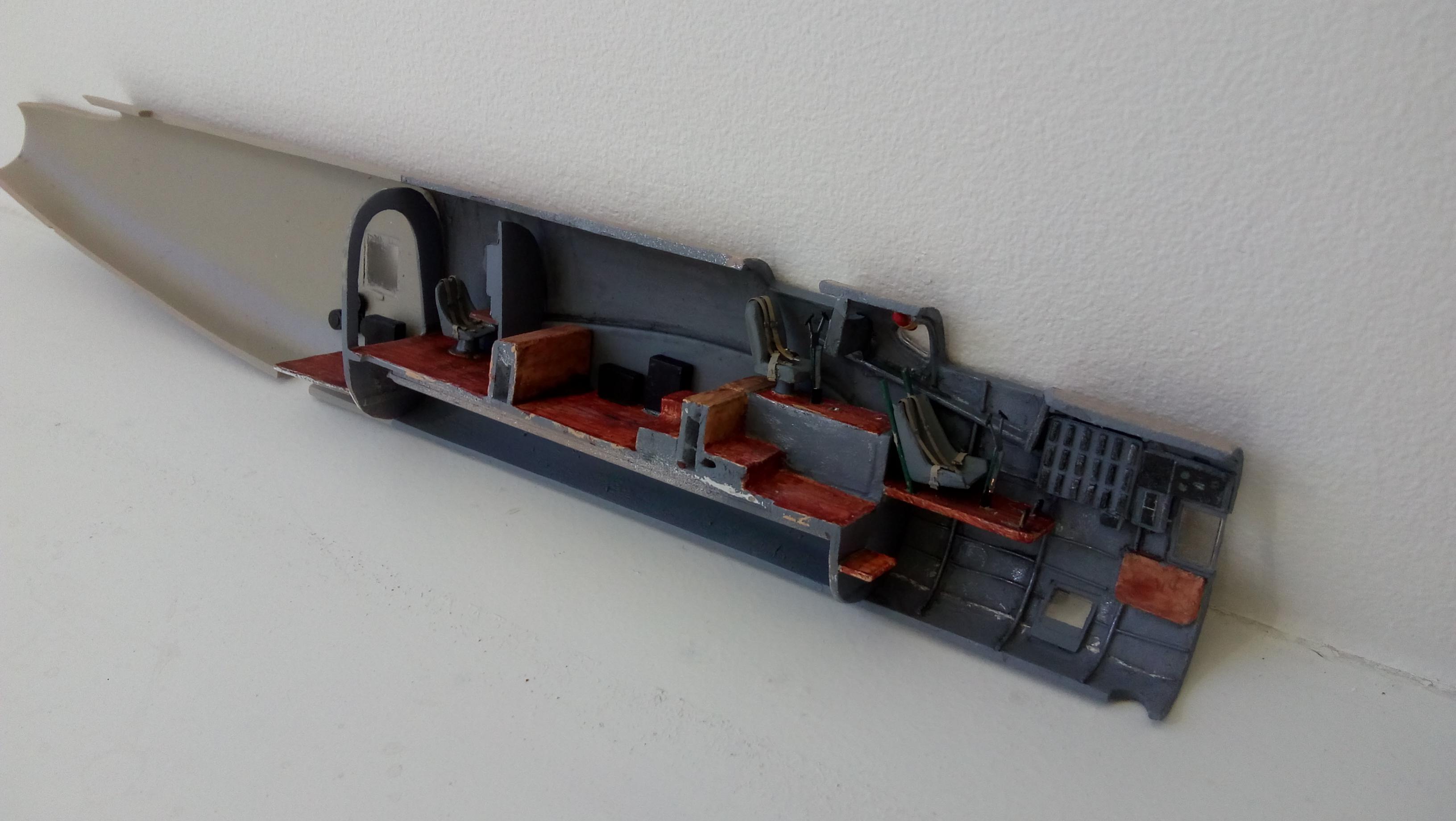 - Het raampje onderin de neus is deels gemaskeerd omdat de voorste vloer er nog in moest;
