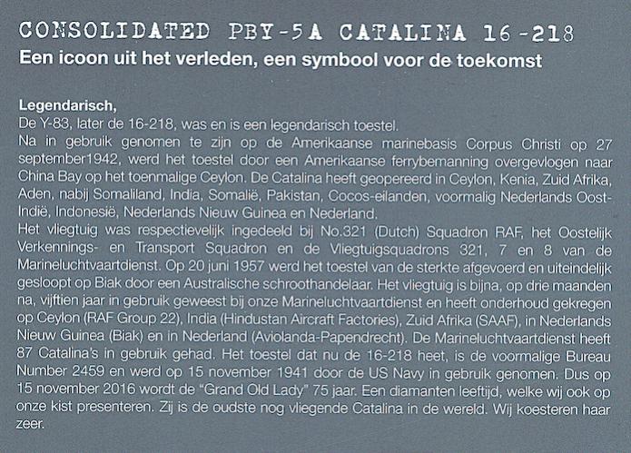 De Y 83, later de 16-218 was een legendarisch toestel. Na ingebruik genomen te zijn op de Amerikaanse marinebasis Corpus Christy, werd het toestel overgevlogen naar China Bay en in gebruik genomen bij Squadron 321. De Catalina heeft geopereerd in Ceylon, Kenia, Zuid Afrika, Aden, India, Somalië, Pakistan, Cocos-eilanden, voormalig Nederlands Oost-Indië, Indonesië, Nederlands Nieuw Guinea en Nederland. Het was bijna 15 jaar in gebruik geweest bij onze Marineluchtvaartdienst. Dit was de hoofdreden om onze Catalina met Bureau Air Number 2459 de registratie 16-218 te geven. Op 15 november 2016 werd de “Grand Old Lady” 75 jaar. De reden om dit boekwerkje uit te geven. Hierin staan de wetenswaardigheden van de Y 83/16-218 en de activiteiten van de PH-PBY.