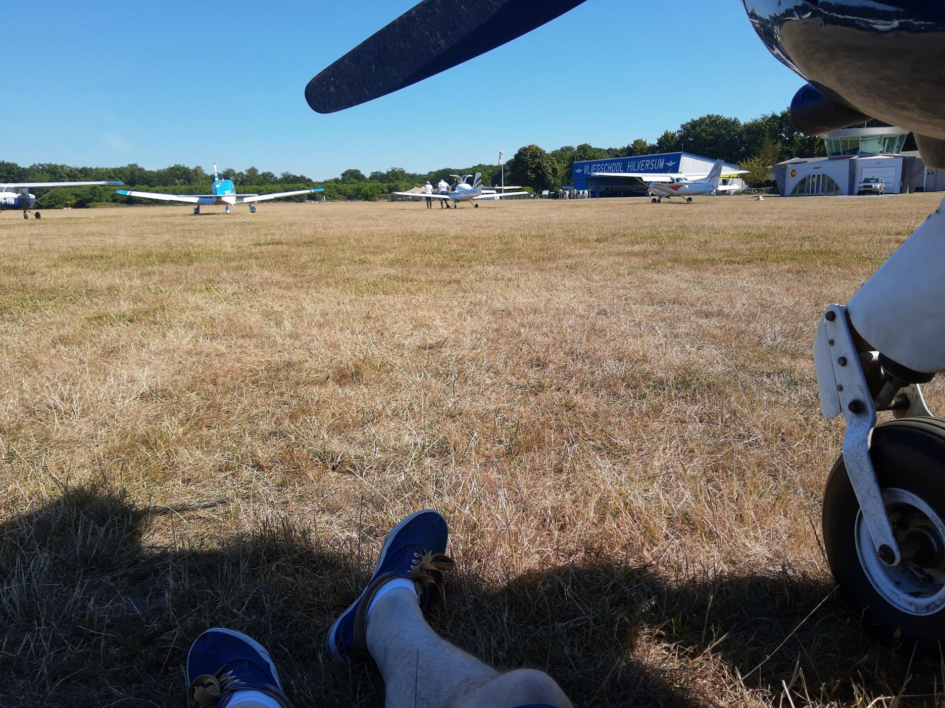 Met het mooie weer (en droog!) begint de dag vaak zo. Na de walkaround nog even in de schaduw wachten tot de instructeur er is. Het kan goed heet worden onder die kunststof kap!
