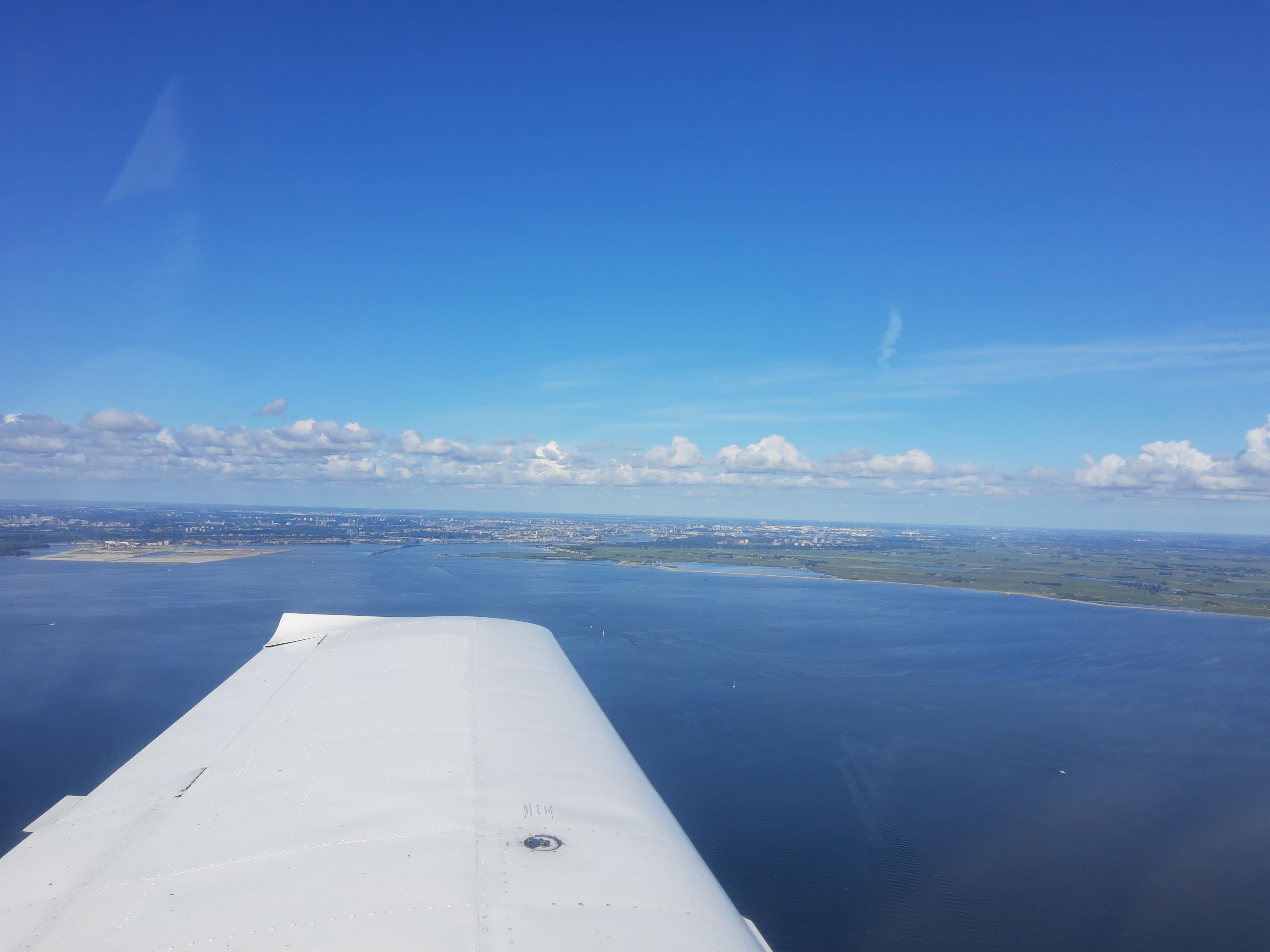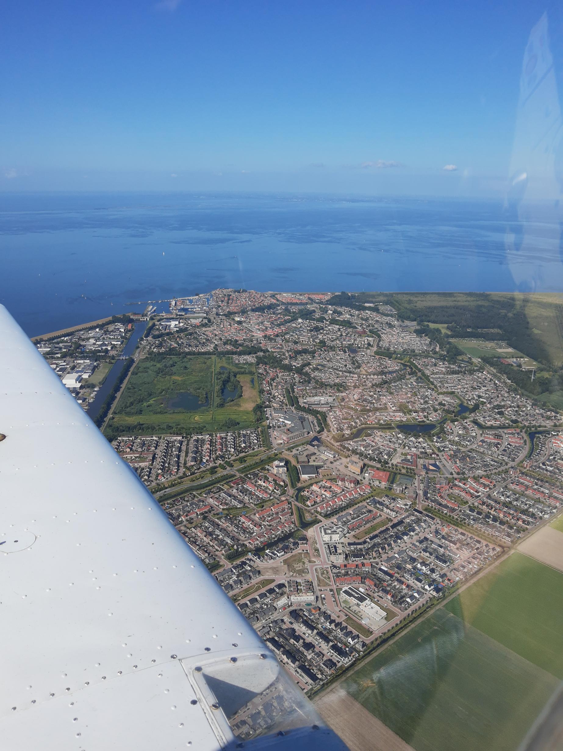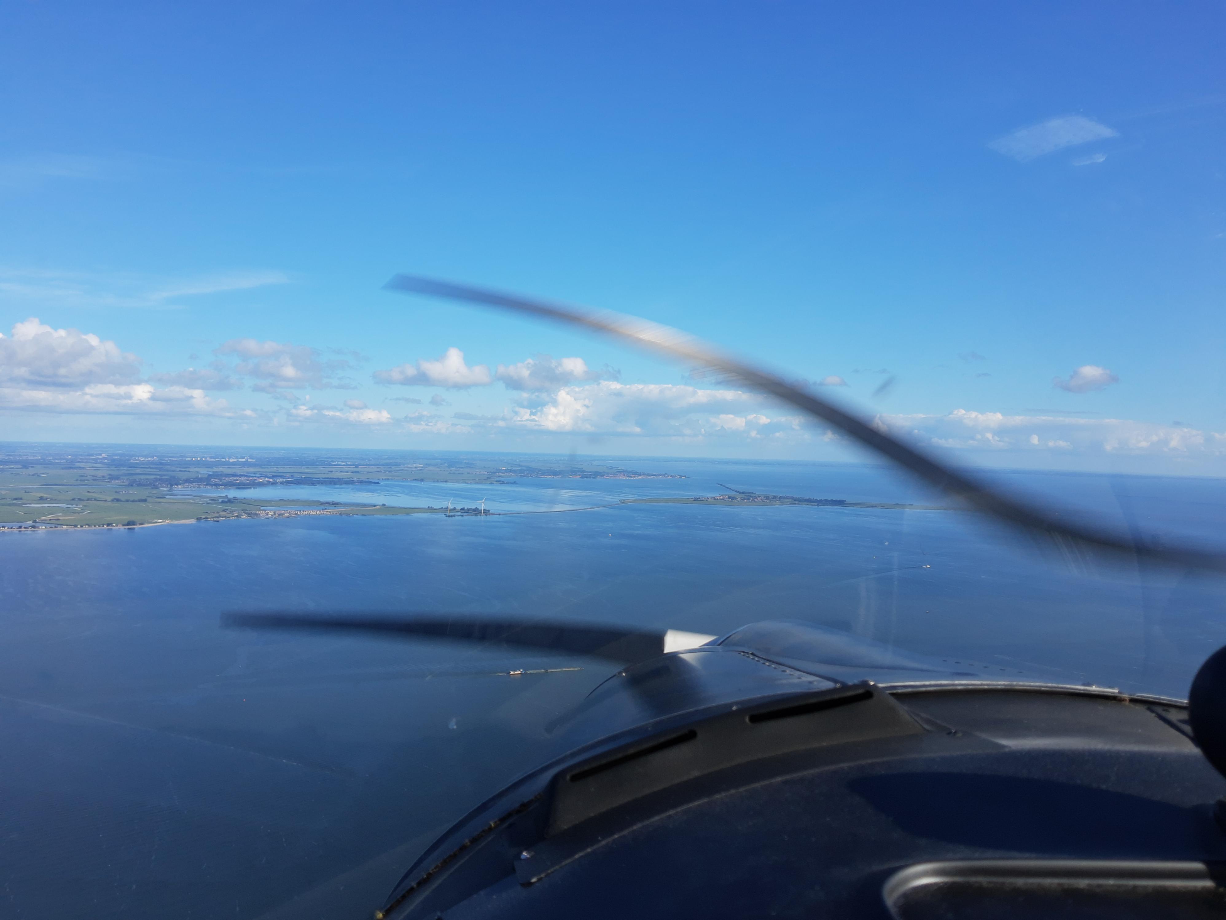 Na take-off, het circuit verlaten en klimmen naar zo'n 1300 voet, zien we hier het Markermeer met in de verte Marken.
