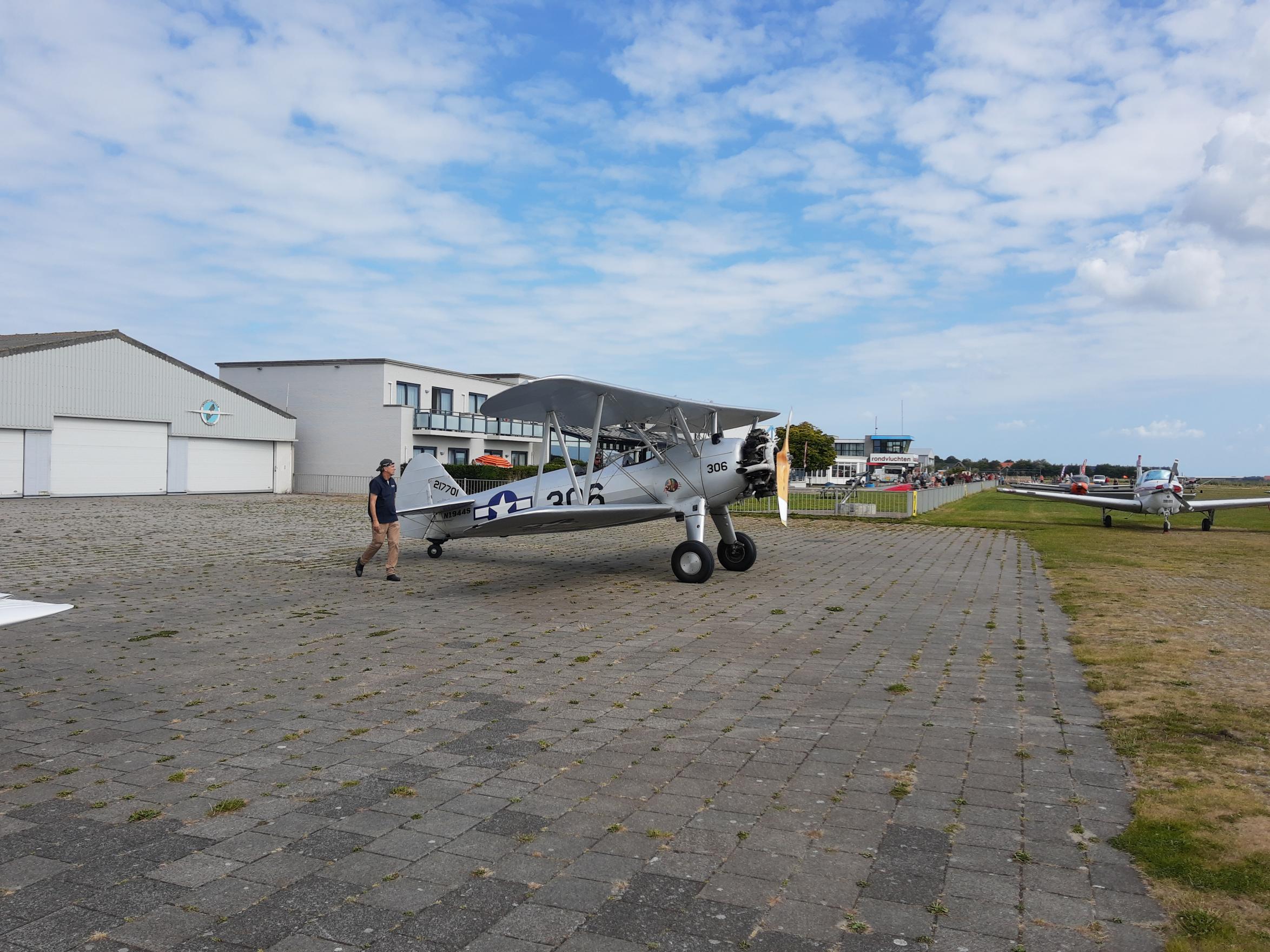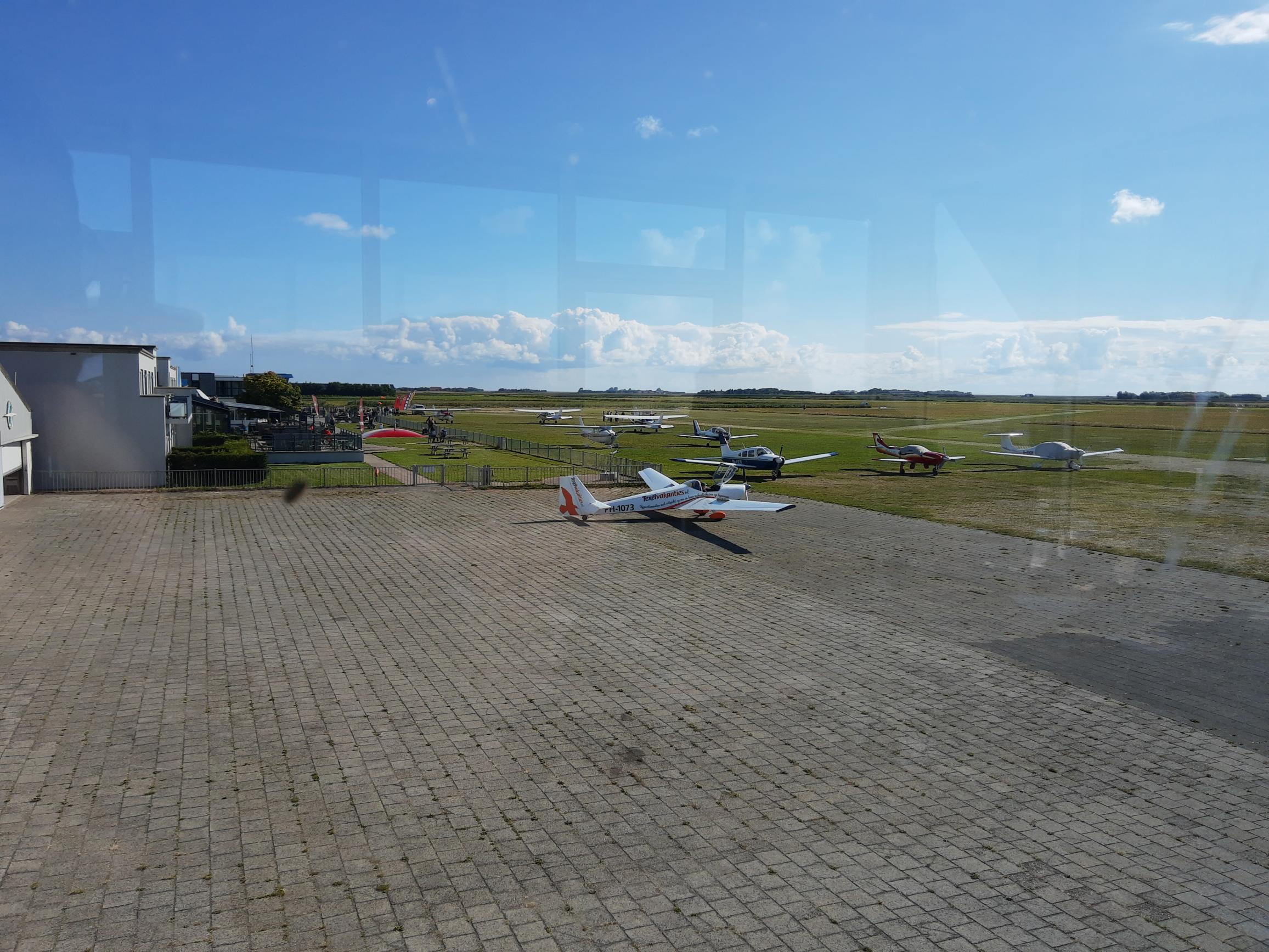 En na een voorspoedige landing hier het uitzicht uit de toren van Texel op het gezellige vliegveld. Het lijkt wel een vakantiepark. Er zijn rondvluchten, een terras, springkussen en de hele dag wordt er gesprongen.