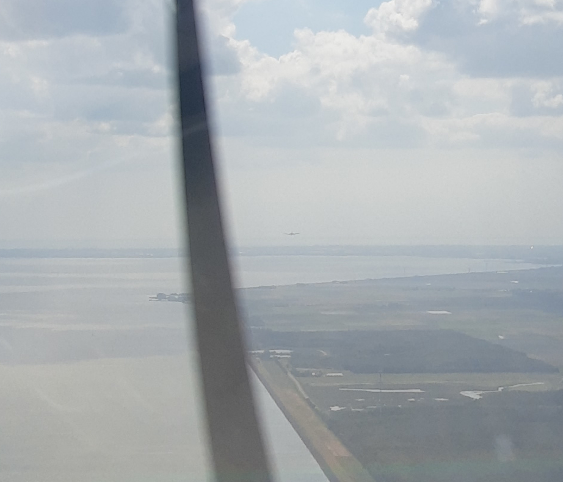 Een van de andere gebruikers van de vliegschool had gisteren een kist op Texel moeten laten staan vanwege slecht weer. Dus mijn instructeur heeft die kist gepakt en ik mocht solo terug. Als je goed kijkt, zie je hem hier in de verte vliegen. Na contact met Amsterdam Information kreeg ik meteen een traffic alert, dus dat werkt ook prima allemaal. We zitten hier nog juist boven Den Oever.