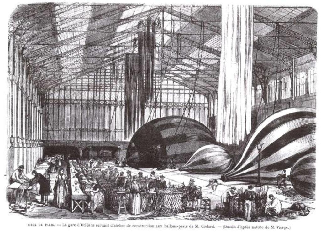 Op de vraag van Boris waar de ballonnen vandaan komen kan ik vertellen dat ze gewoon in Parijs werden gemaakt. Men richtte zelfs een speciale fabriek op in het station ‘Gare d’Orleans’, waarin tientallen naaisters en mandenmakers druk in de weer waren om deze nieuwe lichter dan lucht vaartuigen voor postvervoer te produceren: