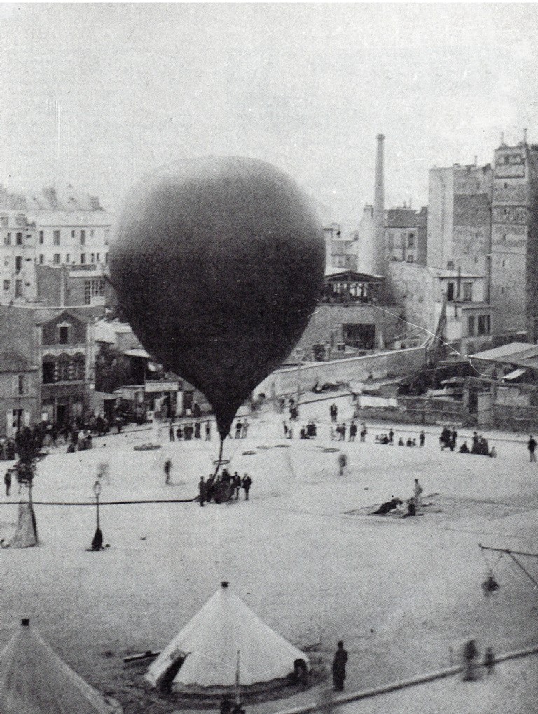 De volgende foto laat zo veel zien. Hij werd genomen in oktober 1870 op ‘la place Saint-Pierre’ aan de voet van de heuvel van Montmartre. Elke ballon kreeg een naam; deze heette ‘Armand Barbès’. Zij vervoerde een generaal Gambetta, die de troepen in Frankrijk zou gaan reorganiseren (wat echter niet lukte). De ballonnen werden opgelaten in de buurt van een gasfabriek; de gasslang is links van de ballon duidelijk te zien. De foto is genomen door de bekende fotograaf/artiest/avonturier NADAR.