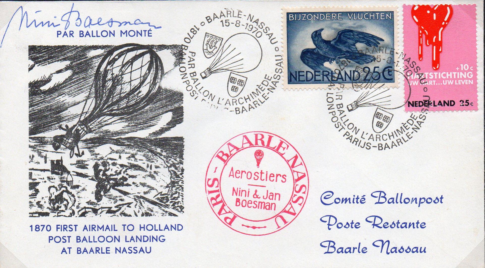 Dit was een een nieuwtje waarvan niemand toentertijd het belang van inzag. De eerste luchtpost had Nederland bereikt. Op het randje maar, eventjes maar, maar toch……..! 100 jaar later, in 1970 dus, zag men er het belang er wel van in. De ballonvaarster Nini Biesman en consorten, organiseerden een herdenkings vaart, waaraan veel ballonnen zouden meedoen. Met de ballonvaart in Baarle-Nassau kon post worden meegegeven, net als in Parijs. Ik was er bij en keek er naar. Ik gaf een envelop mee en filmde wat:
