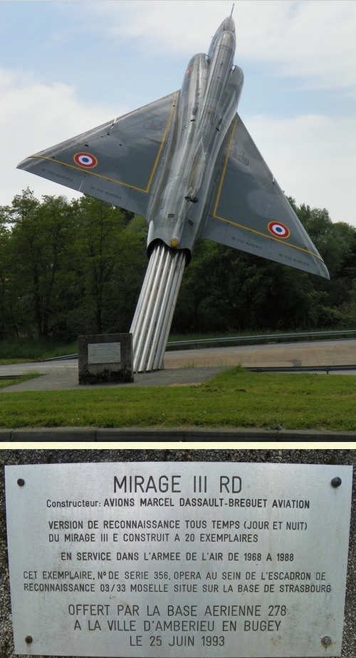 Opgesteld op een rotonde nabij vliegbasis 278. Het voormalige burgervliegveld Bugey heeft een lange geschiedenis. In 1912 heeft Antoine de Saint-Exupéry (Vol de Nuit, Le Petit Prince) er zijn doopvlucht gemaakt.