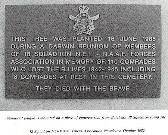 Ik plaats hier ook een plaque die geplaatst is bij een boom die in 1985 speciaal voor het 18 Squadron N.E.I. is geplant (ter herinnering aan de 110 doden van dit squadron) tijdens een bijeenkomst van de "18 Squadron NEI-RAAF Forces Association" waarbij ook een priester aanwezig was om zijn zegen te geven.
