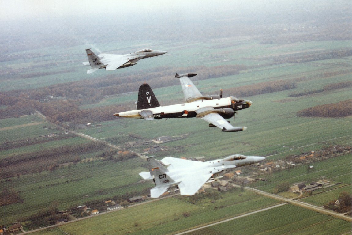 Lockheed SP-2H Neptune "201" van de MLD wordt hier begeleid door twee McDonnell-Douglas F-15C Eagle's "79-0018" en "79-0020" van het 32 TFS uit Soesterberg.