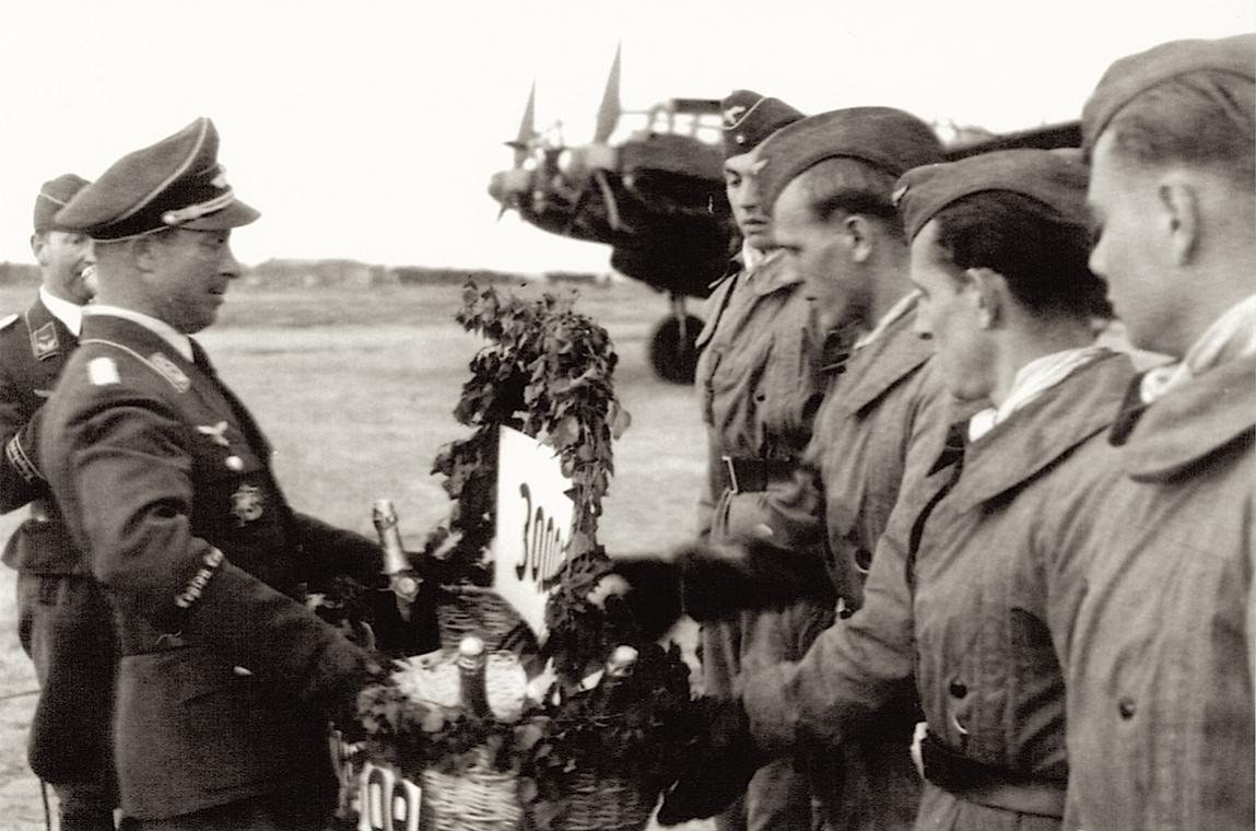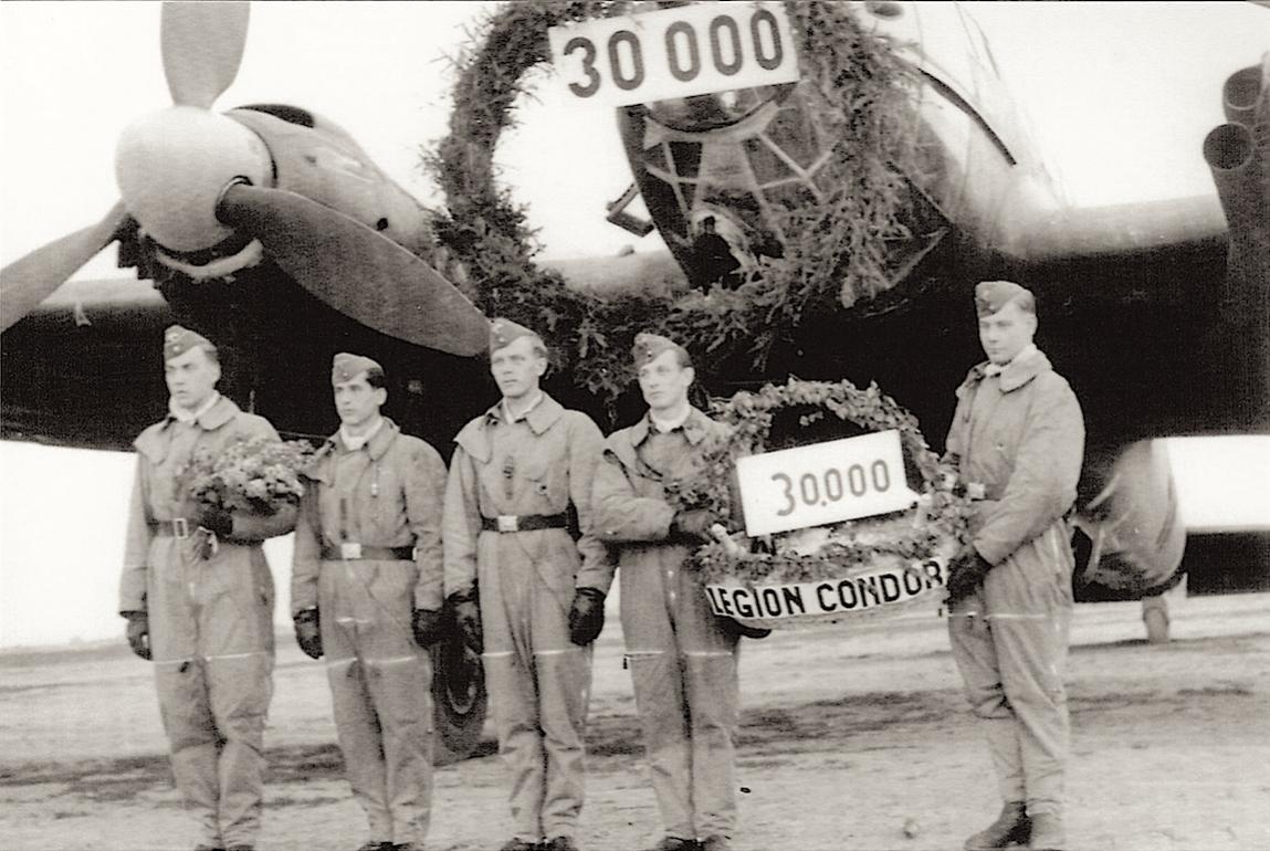Heinkel He 111, 1943. 30.000ste "feindflug" van KG 53 door Fw Engel gevlogen. De "Kriegsberichter" met zijn microfoon is ook aanwezig (onderste foto, een beetje verdekt geheel links).