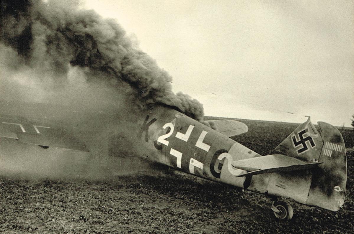Messerschmitt Bf 109 G4/R6 (WNr. 14997) "KJ+GU' in brand (7./JG 52).