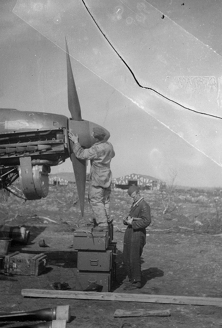 Een foto (wat klungelig gerepareerd) van twee monteurs bij een Stuka: