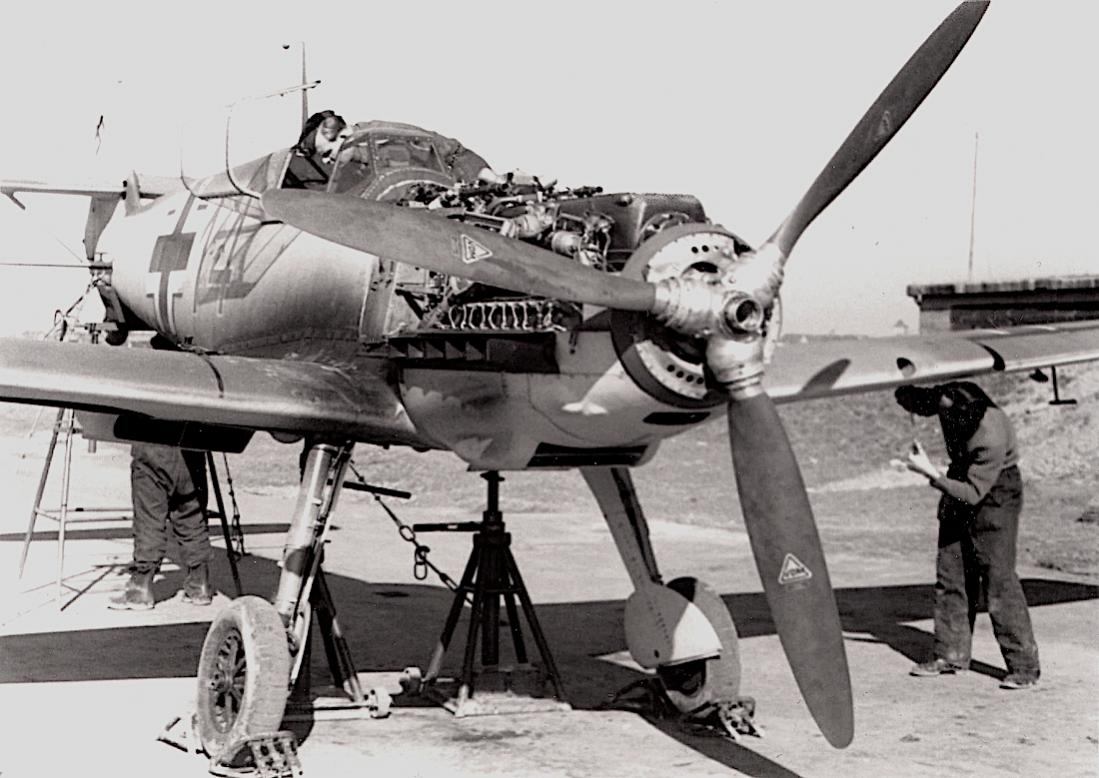 Foto 645 toont een toestel van 3./KGrzbV.12 met het door die eenheid gebruikte embleem. Op Ockenburg, gedurende reparatie.