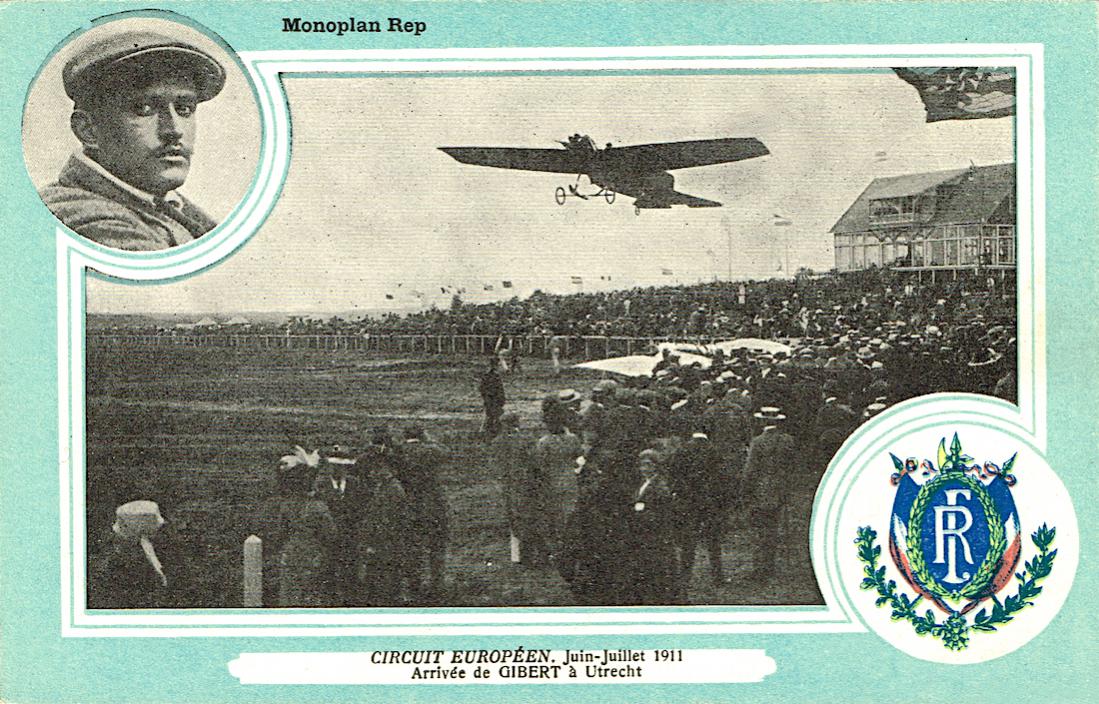Aankomst aviateur Gibert te Utrecht. Wat niet klopt omdat het Soesterberg is. Waarom Utrecht is vermeld? Blijkbaar makkelijker te traceren voor buitenlands publiek.