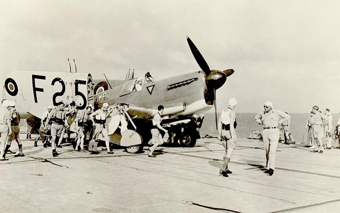 Tekst achterzijde: Aan boord van Hr.Ms. 'Karel Doorman' wordt een 'Firefly' in gereedheid gebracht.