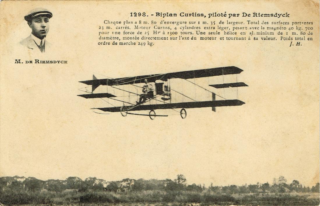Jonkheer Frederik Lodewijk (Freddy) van Riemsdijk in/op zijn Curtiss. Hier M. de Riemsdyck genoemd op een Franse kaart.