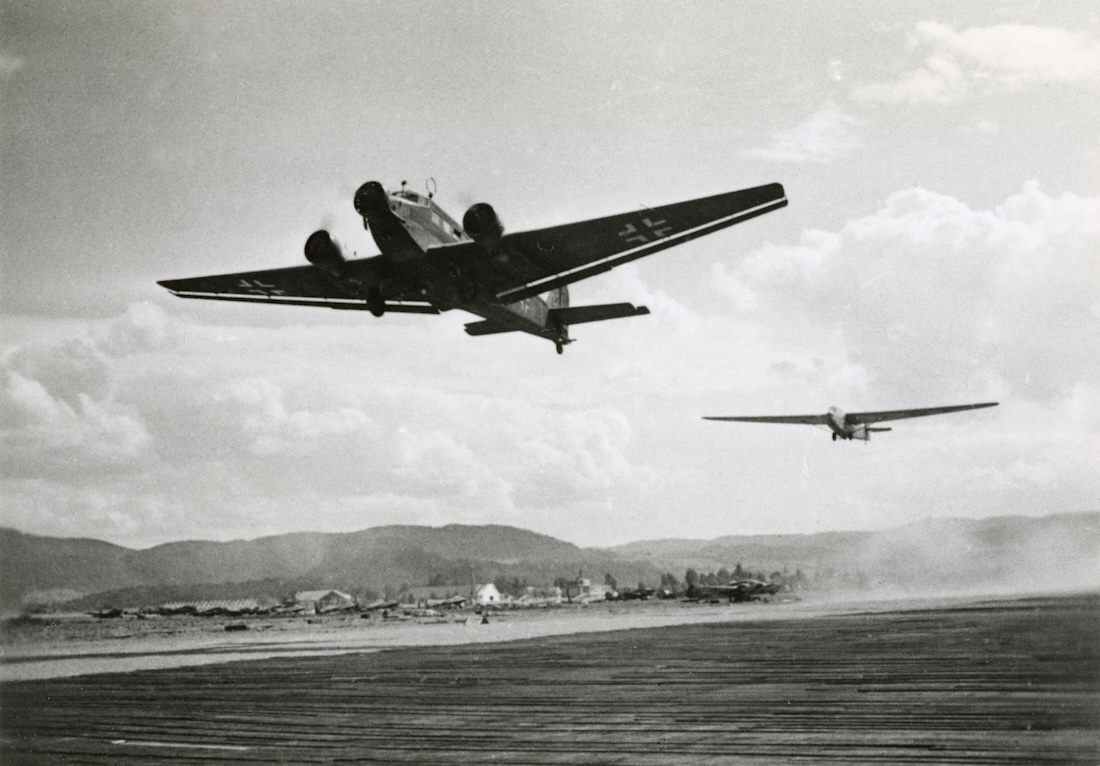 Start 20. Mai 1941, nähe von Athen. Ju 52, im schlepp ein Lastensegler DFS 230 mit 10 Fallschirmjägern.
