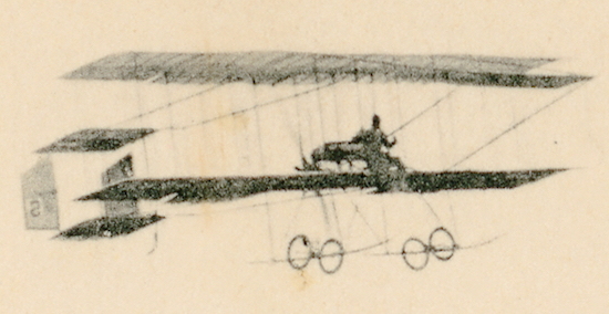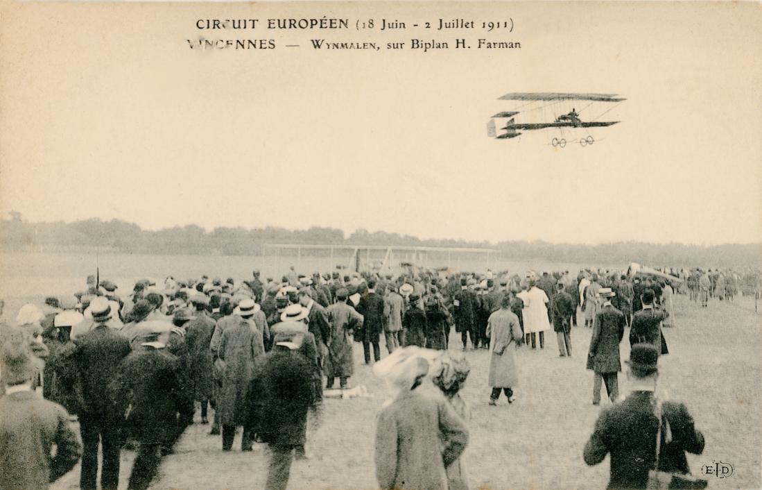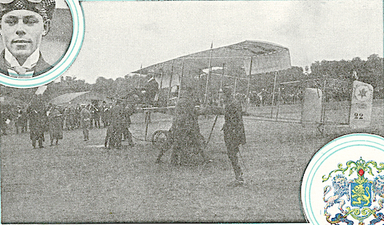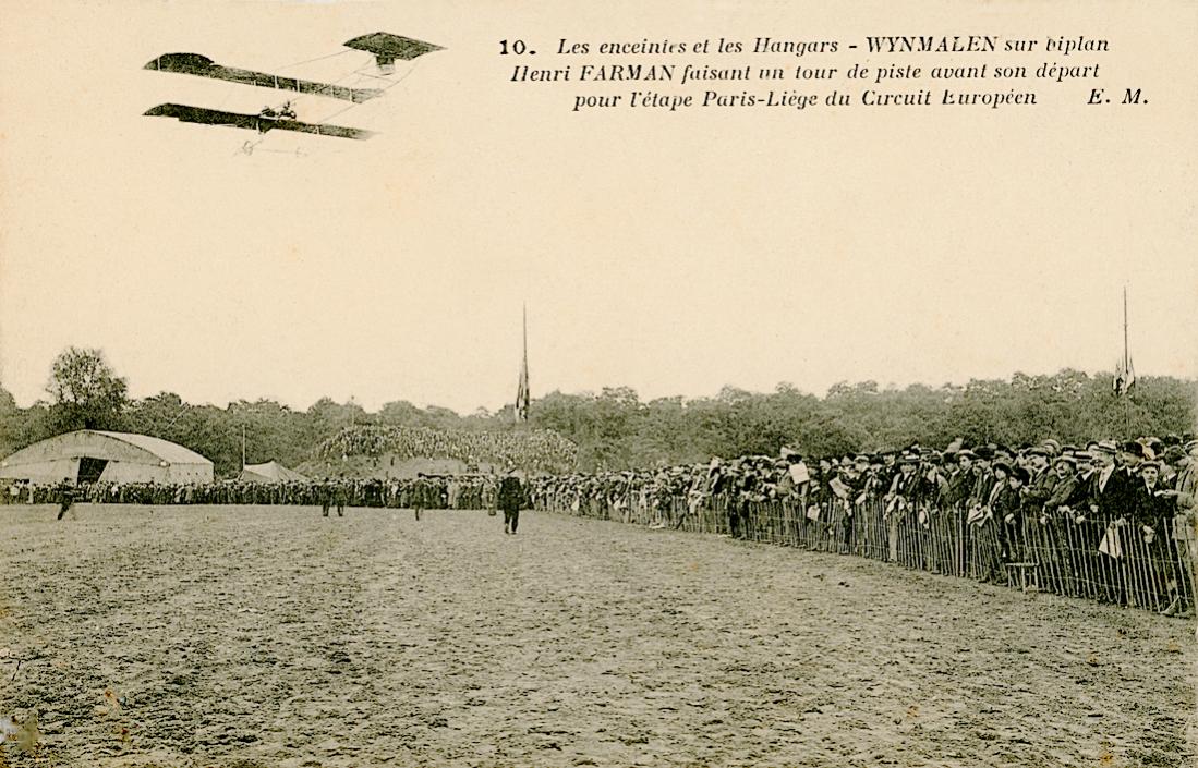 Wijnmalen vertrekt voor de etappe Parijs–Luik in/op zijn Farman.