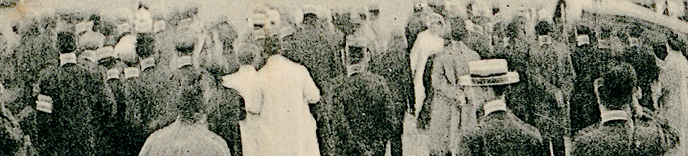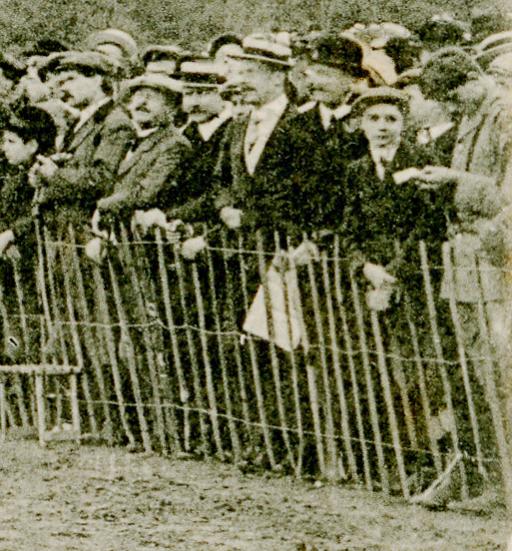 Zie de uitsnede. De man links kijkt naar het veld. Daarnaast een die de lucht in kijkt. Dan weer drie die naar het veld kijken (één daarvan richting fotograaf?). Dan ook nog twee jeugdige personen die bezig zijn met een programma of zoiets (aantekeningen maken?).