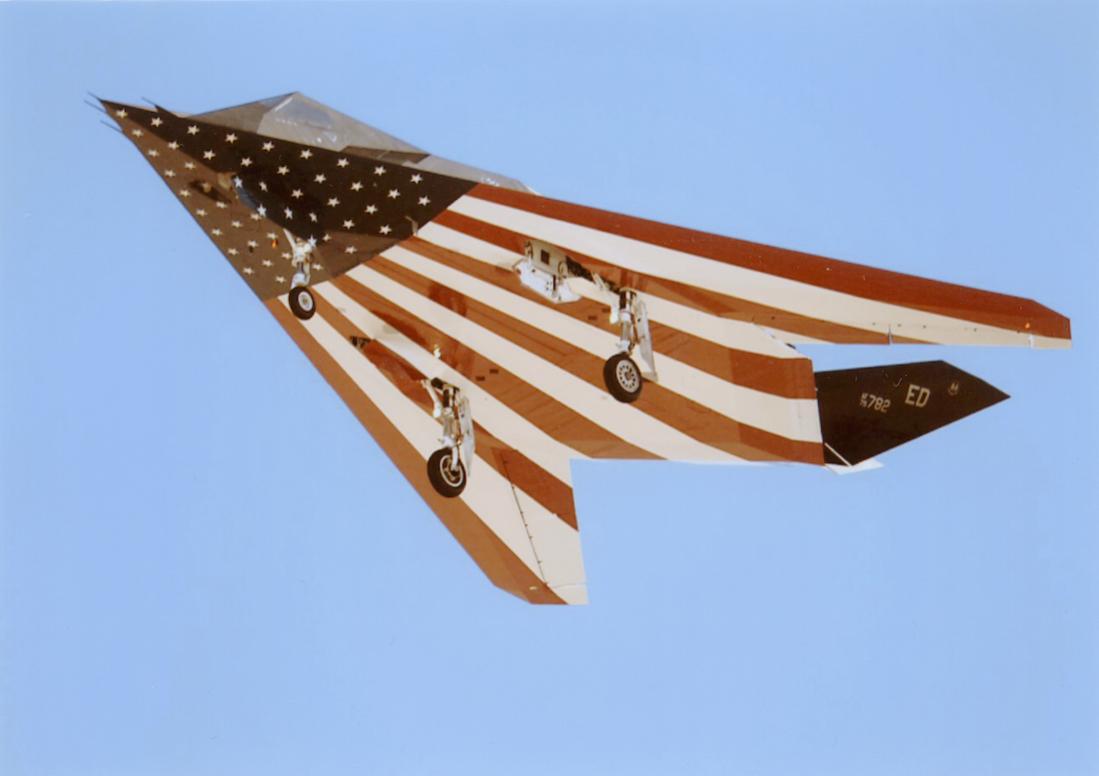 While wearing a flag painted on its bottom surface, this aircraft revealed the type's existence to high-ranking officials at Groom Lake on 14 December 1983, the first semi-public unveiling of the aircraft.
