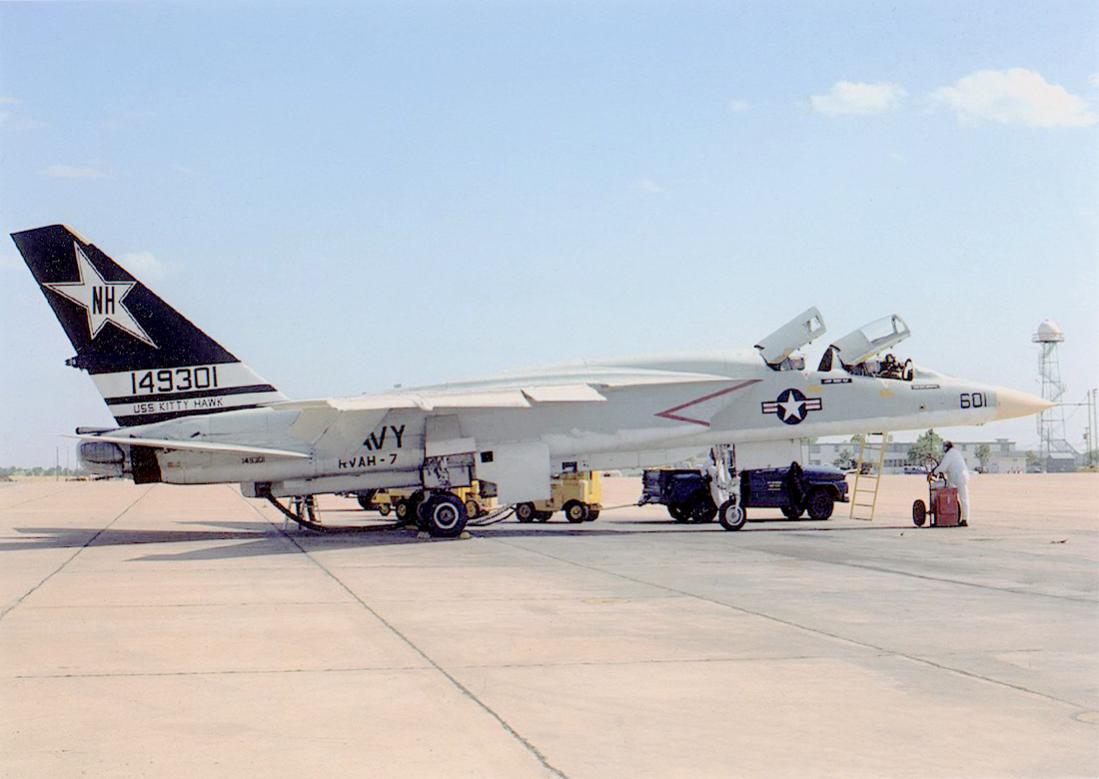 Het toestel heeft namelijk al de AN/ALQ-105 ECM-pods en RHAW (Radar Homing and Warning) antennes op de fintip en wingtips. De linker ECM-pod zie je hier als witte buis met zwarte plekken boven de bellytank.