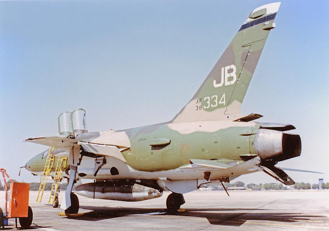 38334 (= 63-8334) (MSN F111). Republic F-105F-1-RE Thunderchief. Converted to F-105G. Crashed with 562nd TFS Jun 14, 1978 12 mi from George AFB, California due to flameout on high final. Both crew ejected safely.