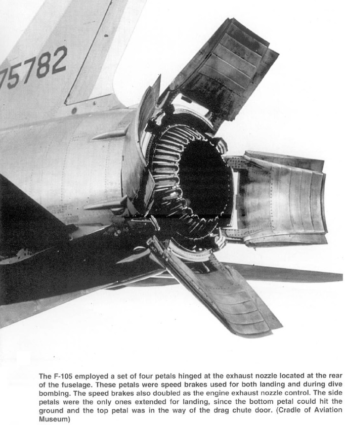 The Thunderchief also featured an interesting airbrake system consisting of four “cloverleaf” segments around the jet exhaust that opened like flower petals. The cloverleaf exhaust also served as a variable engine exhaust, opening nine degrees automatically when afterburner was engaged. Only the horizontal petals could be extended when the aircraft’s landing gear was down.