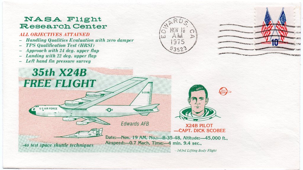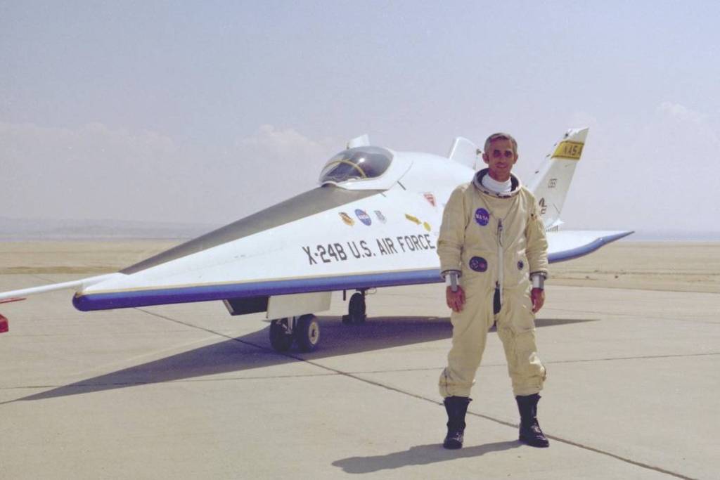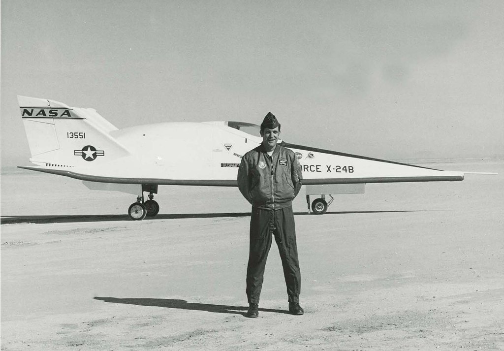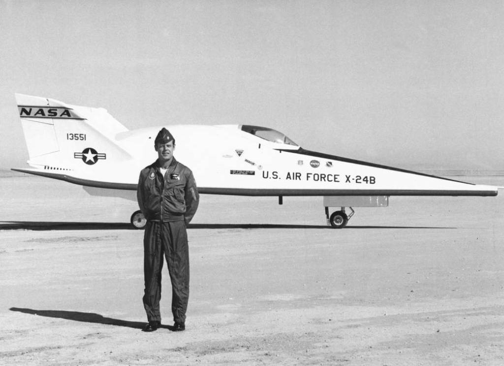 Bedankt voor de reactie Boris. De foto van Manke, die ik opgestuurd heb, is niet helemaal juist. Hij poseerde daar niet voor de XB-24B, maar voor de Northrop HL-10. Dit laatst genoemde toestel was tonnetje rond en het was een wonder dat het überhaupt kon vliegen. Het heeft nauwelijks iets wat je vleugels kunt noemen. Hier een foto van Manke voor de XB-24B (Uit 1975 en niet uit 1973, zoals ik oorspronkelijk aangaf):