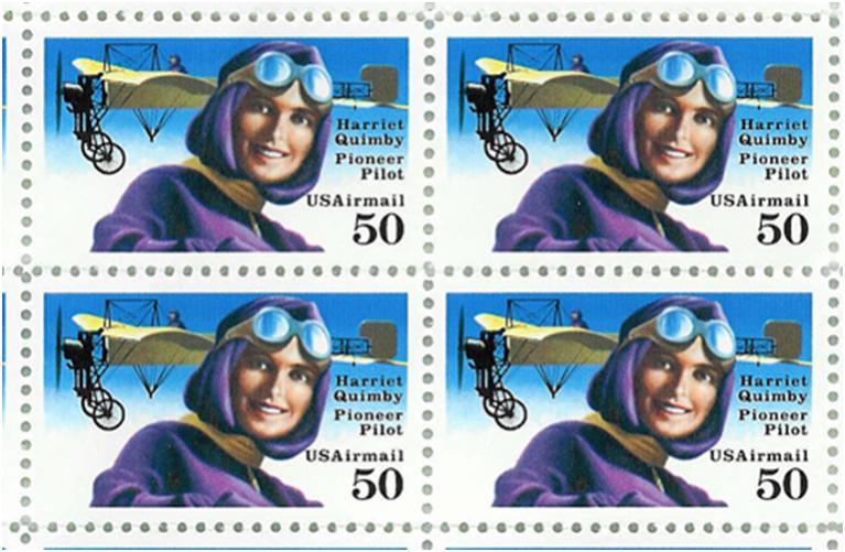 In 1991 werd in Amerika een postzegel uitgegeven waarop Harriet Quimby stond, een van de weinig vrouwelijke piloten die in de US op een postzegel werd geëerd (meer dan in Nederland, dat weer wel). Zij was van beroep journaliste en toneelrecensente en de eerste vrouw die een vliegbrevet kreeg in 1911. Minder dan een jaar later, op 16 april 1912 vloog ze als eerste vrouw over het Engelse kanaal. Dat feit kreeg weinig aandacht, want de dag ervoor, op 15 april, was de Titanic gezonken en daarvan stonden alle kranten vol.