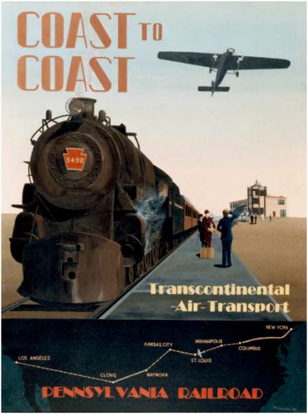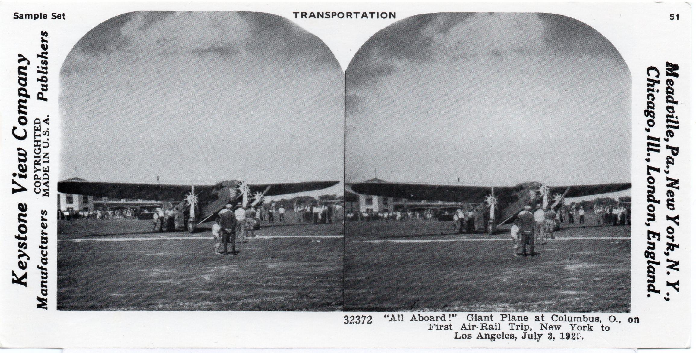 Op 7 juli 1929 was er in de Verenigde Staten de eerste transcontinentale trein/vliegtuig reismogelijkheid tussen New York en Los Angeles, die ongeveer 48/51 uur in beslag nam. Het eerste gedeelte werd afgelegd in de slaap/ nachttrein van de Pennsylvania Railroad van New York naar Columbus, Ohio. Daar gingen de 20 passagiers met veel ‘toeters en bellen’ aan boord van een Ford Trimotor op Port Columbus International Airport. (zie de stereokaart) Ze maakten tussenlandingen in Indianapolis, St.Louis, Kansas Ciry, Whichita en eindigden het tweede deel van hun reis in Waynoka , Oklahoma. Daar gingen ze weer in de slaaptrein van de Santa Fe Railway voor de nachttrip naar Clovis, New Mexico. Ze waren er nog niet. Hup, weer in een Ford Trimotor nu naar Albuquerque, Wislow, Az. Naar Los Angeles of San Francisco. In de volgende periode had men veel last van slecht weer en kon er niet worden gevlogen.