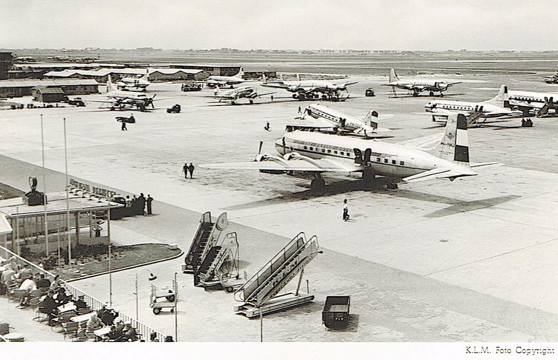 Schiphol platform. Op de voorgrond de Douglas DC-6 PH-TPJ 'Prinses Juliana'. in dienst 22.04.1948, uit dienst 22.03.1952. Verongelukt te Frankfurt.