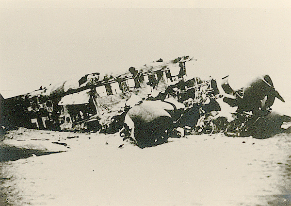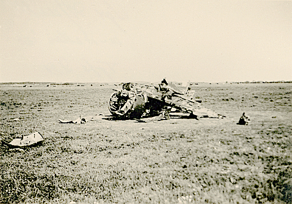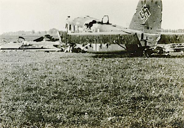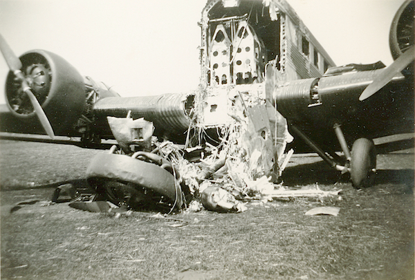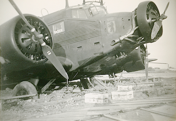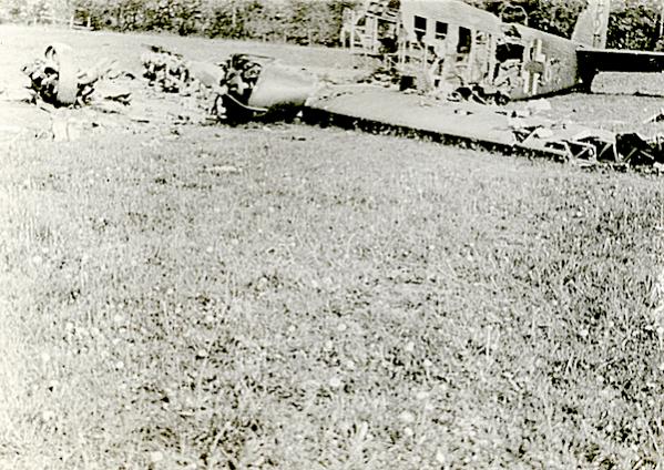 Foto 84. Tekst bij de foto: Door pantserwagen kapotgeschoten Junkers transportvliegtuig.