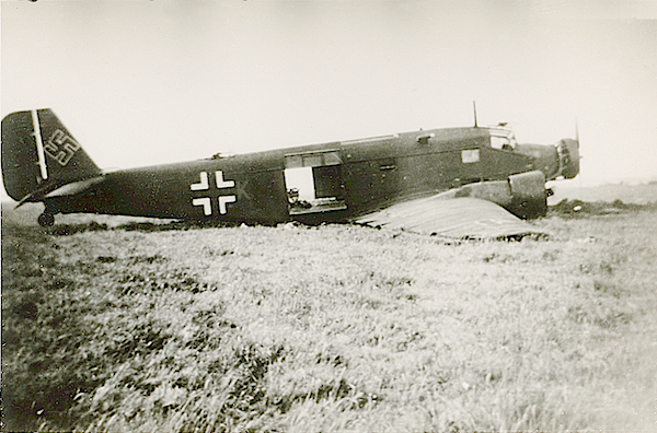 Foto 85. Tekst bij de foto: Door pantserwagen kapotgeschoten Junkers 52. (Voorzijde). 10 Mei '40.