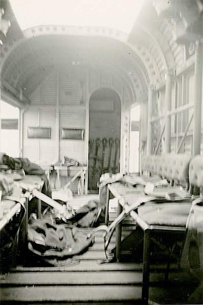 Foto 90 (niet scherp). Tekst bij de foto: Interieur J.U. 52. Men ziet uitrustingsstukken verspreidt liggen.