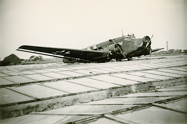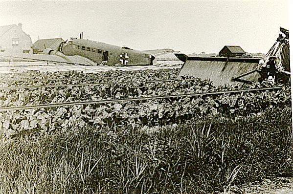 Foto 92. Ju 52 van KGzbV 1. Tekst bij foto: Op de broeikassen gedaalde J.U. 52 transportvliegtuig.