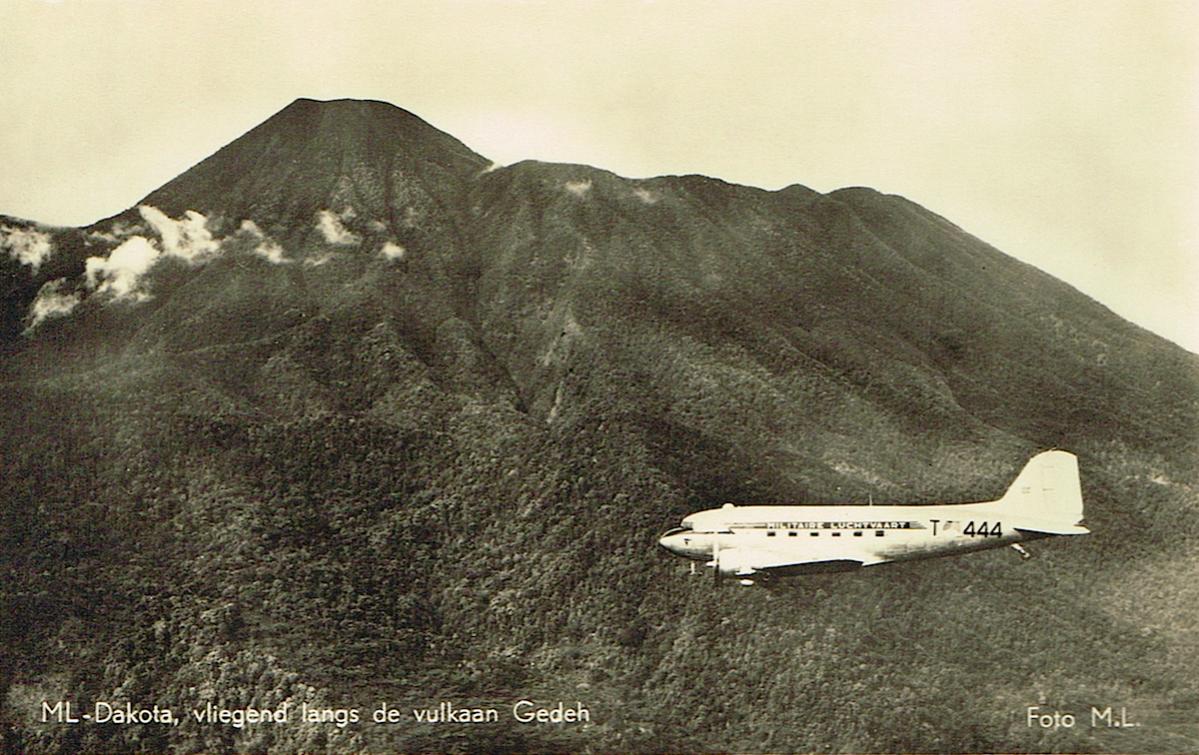 Dakota 'T-444' vliegend langs de vulkaan Gedeh.