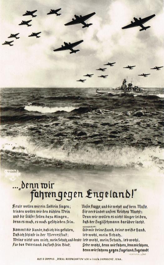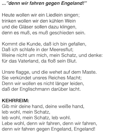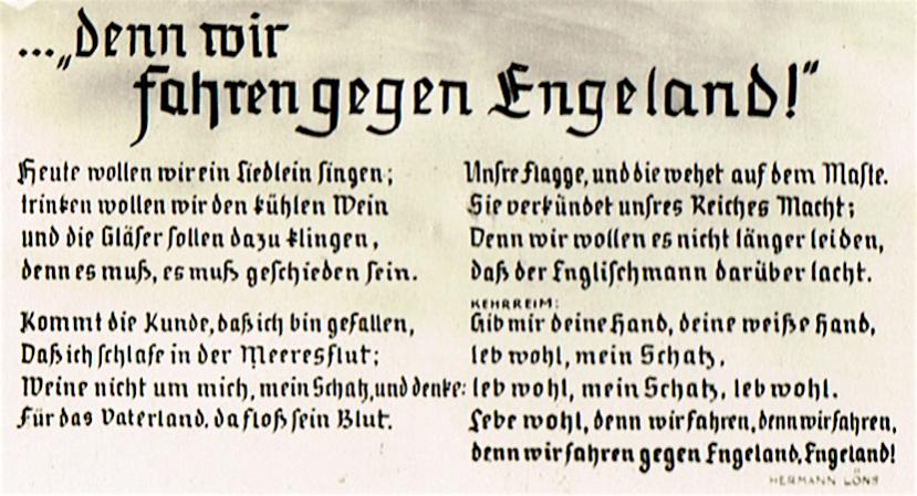 Dat is een mooie aanvulling op mijn kennis van de Duitse oorlogsliederen. Ik kende dit lied alleen van de eerste regel en de daaropvolgende aanvulling door Oranjeklanten: plons, plons.