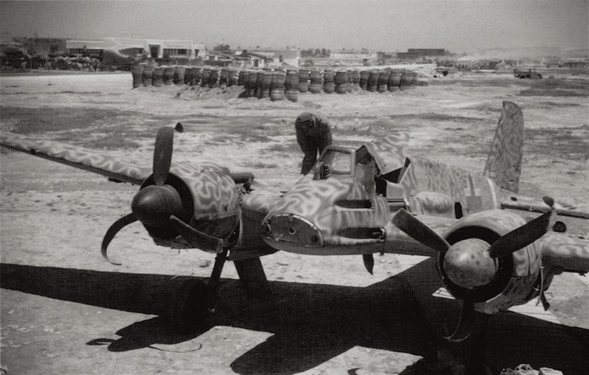Deze Messerschmitt Me 210 A-1 werd gebouwd in Augsburg op 10 november 1942, had Werknr. 2100110205 en kreeg GT+VW als Stammkennzeichen. Met het verkorte Werknummer 0205 werd het geleverd aan 9./ZG 1 in Noord-Afrika waar het de code 2N+LT kreeg. Het werd voor 40% beschadigd op 4 maart 1943 toen de piloot per ongeluk de machine in de wal van een “blast pen” reed. De machine werd gerepareerd en stond op 27 mei 1944 nog geregistreerd als vliegend.