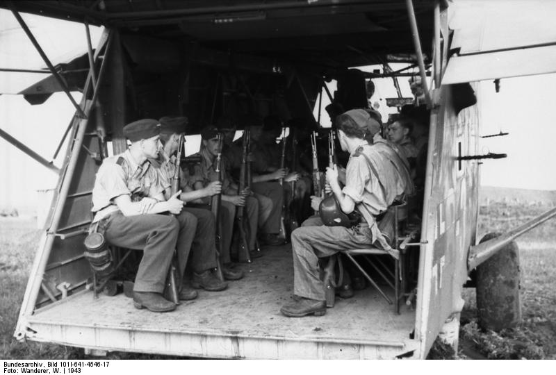 Foto 357a. Bundesarchiv_Bild_101I-641-4546-17. Opname uit 1943. Transport van soldaten. Het toestel is uitgerust met machinegeweren als afweermiddel.