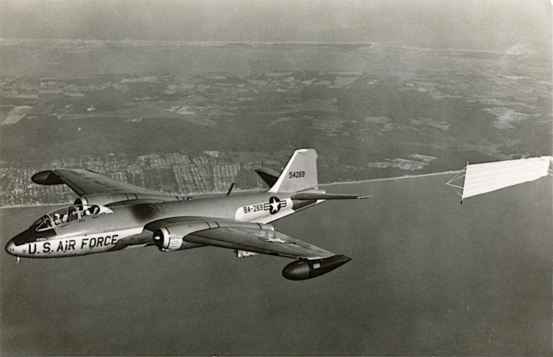 54269 = 55-4269. (MSN 371). Martin B-57E-MA. Converted to combat configuration in 1965. 1966: USAF 8th BS. 7/1968: “Compass Sight” tests. 1971: USAF 363rd TRW. 10/14/1971: Crashed on approach to Shaw AFB, SC. Both crewmen were killed. (Bron: Joe Baugher)