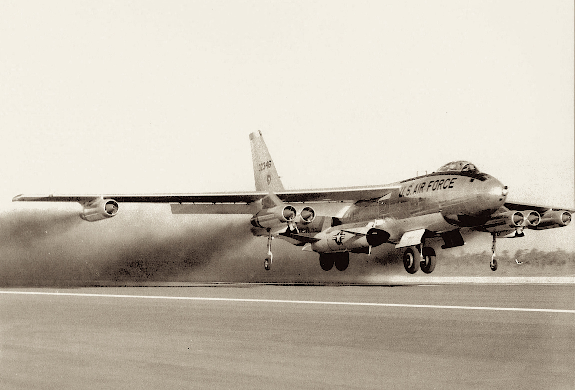 Boeing YDB-47B Stratojet (conversie in 1953 van DB-47B) met Bell Rascal aan de rompzijde.