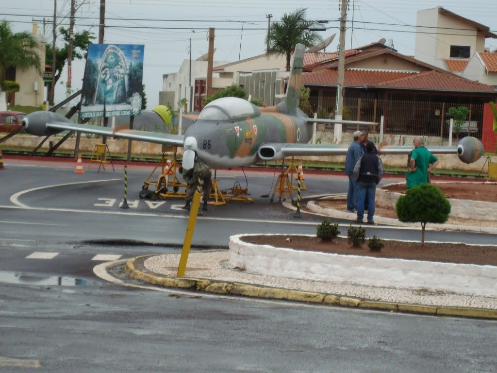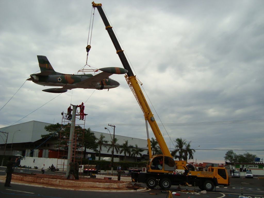 Het plaatsen van een Aermacchi MB 326 ( AT-26 Xavante ) op een paal voor een winkelcentrum in Pompéia.