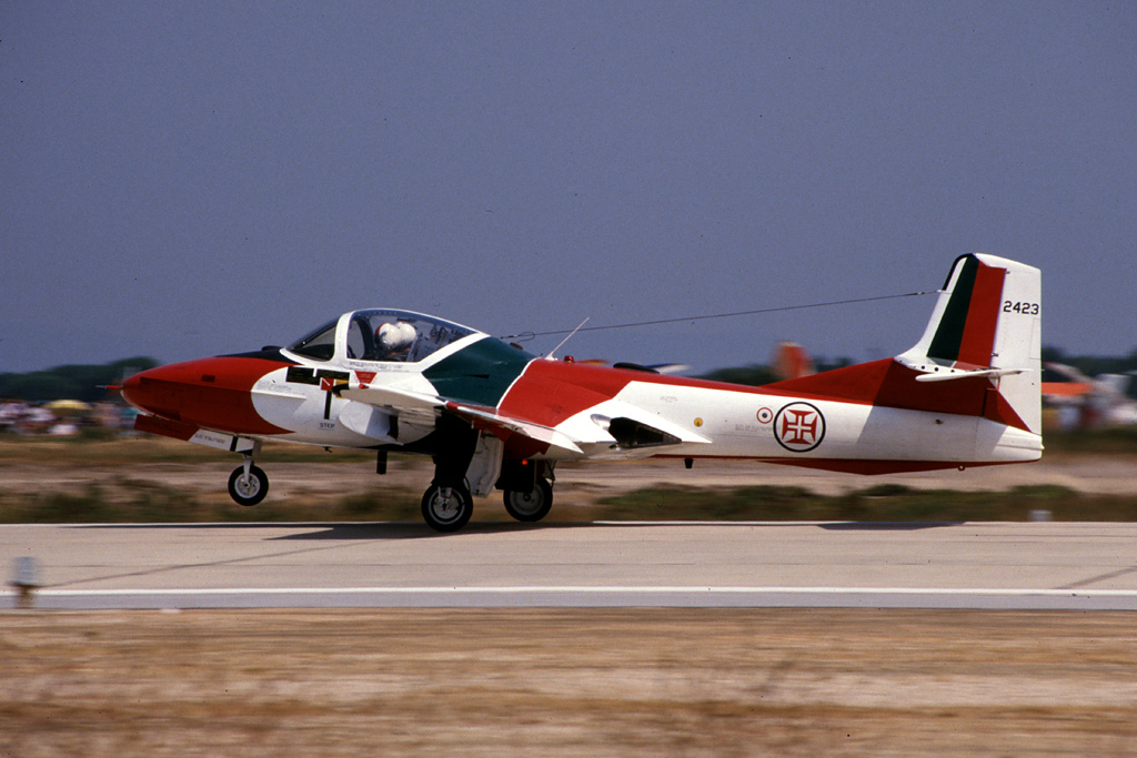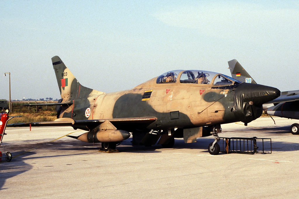 Een ander type dat al jaren verdwenen is uit de inventaris van de Europese Luchtmachten (en dus ook van Portugal), is de Fiat G-91. Hier zie je G-91T 1803 van Esq. 301 mooi in het zonnetje staan op Montijo op 28 juni 1987.