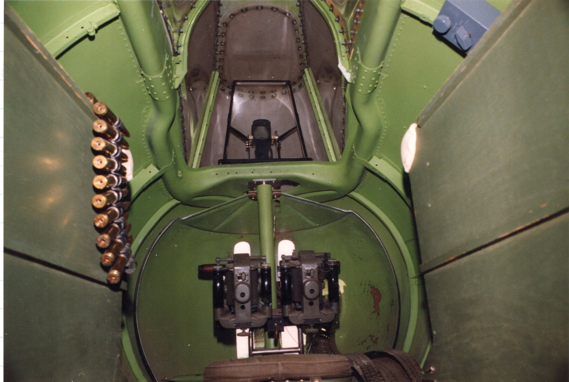 Binnenkant van de B-17 naar achteren kijkend. Bovenin de ramen die op dat moment aan de buitenkant met grijs plaatwerk waren afgedekt. Daarvoor het vizier. Daaronder 2 vuurwapens, waarvan de achterkanten goed te zien zijn. Helemaal onderaan het stoeltje waarop de boordschutter zit.