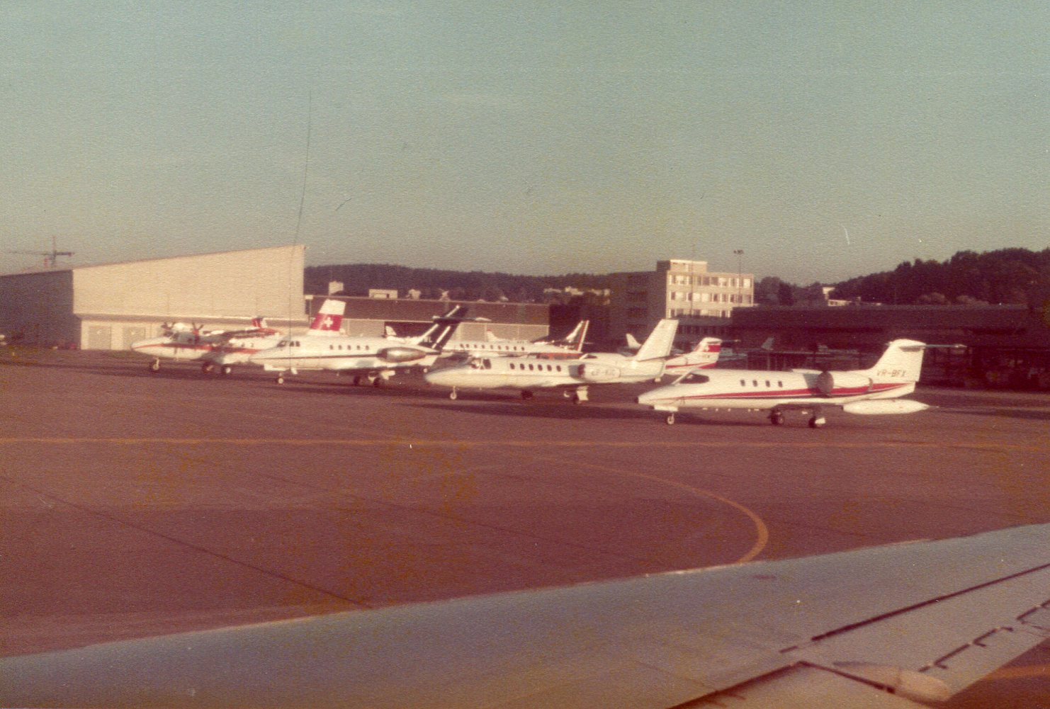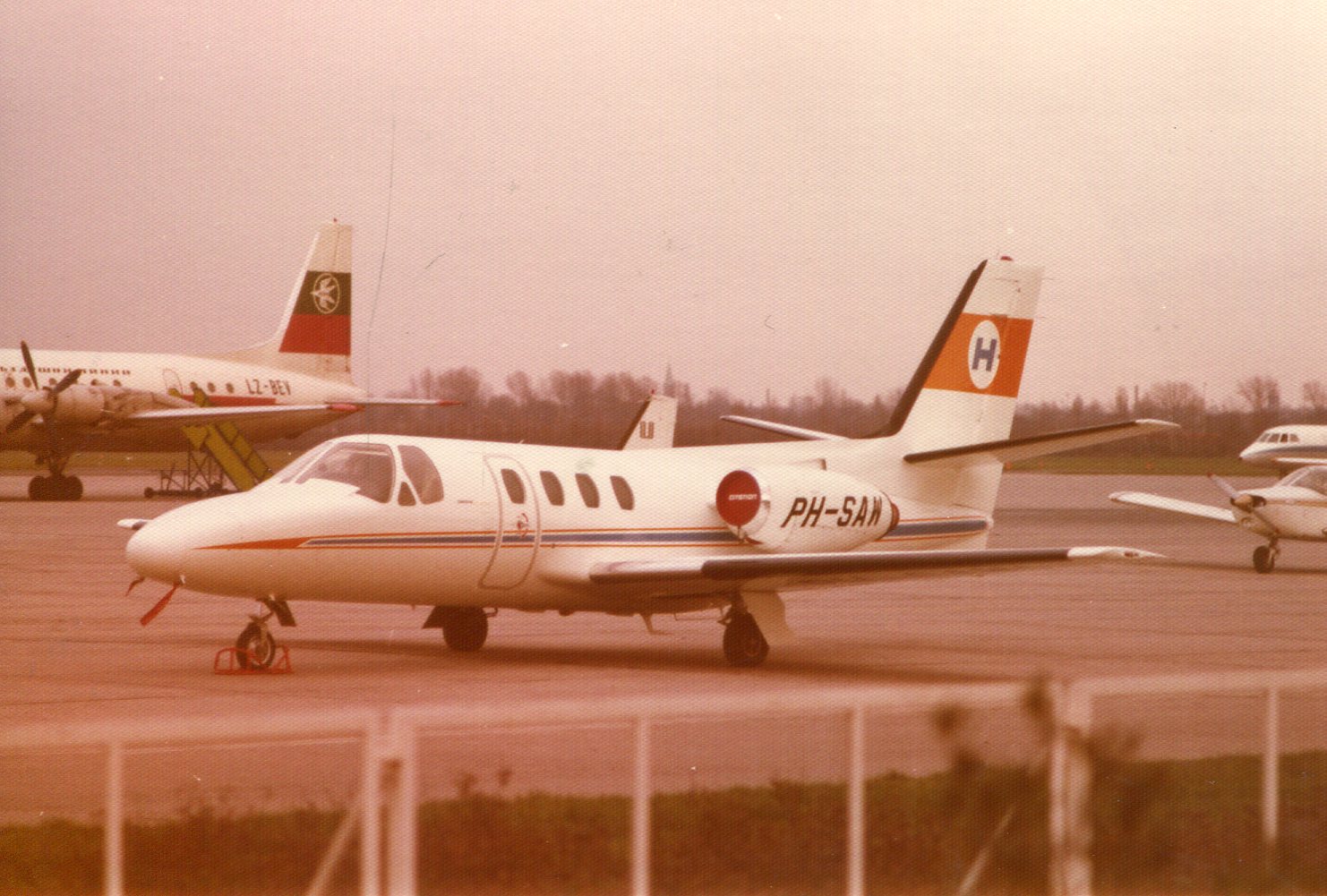 Links een Il-18 van Balkan Bulgarian; tussen beide in de PH-KED, de Piper Aztec van Kuiken Vliegbedrijf en rechts het neusje van een Piper-28 Cherokee en een Falcon-20 bizjet.