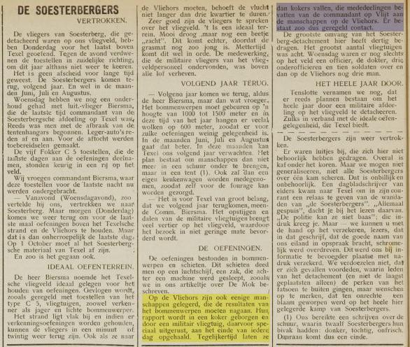 Zie bovenstaand een krantenartikel van 10 februari 1937. Het is afkomstig van de Texelsche Courant, raadpleegbaar via het Internet (niet de databank van de KB0. De Vliehors is al veel langer in gebruik dan 1948. Eerst werd in samenwerking met de MLD van de Kooy op de Mok geschoten en geoefend in bommenwerpen. Van lieverlee ging dat naar Vlissingen (1930, 1931) en uiteraard de Harskamp. Vanaf medio 1935 ging men naar de Vliehors. Vliegveld Texel kwam medio 1934 gereed. De Kooy was na 1928 geen optie meer om te bivakkeren, doordat men er in tenten was gelegerd. Vandaar het uitstapje naar Vlissingen. Uiteindelijk kwam men om veiligheidsredenen terecht op de Vliehors. Een cementen oefenbom kan nog steeds (te) veel kwaad aanrichten.