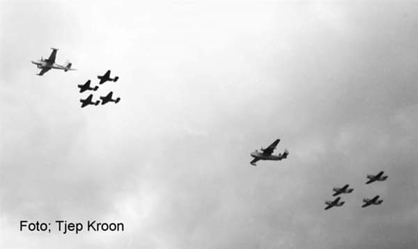 Hierin werd ondermeer in een formatie vlucht van de Marine Luchtvaart Dienst onder het motto " tussen lucht en water" een demonstratie gegeven van een MLD Neptune, een MLD Mariner 4 MLD Avengers 4 Britse Gannets en 4 Britse Sea Hawks ( op de foto niet zichtbaar)