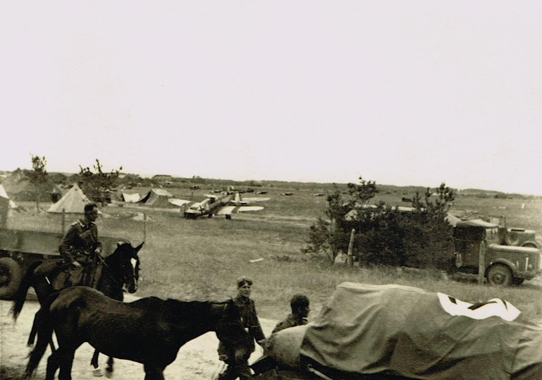 Feldflugplatz in Rusland en voorbijtrekkende soldaten met paarden en wagens.