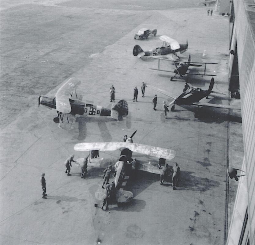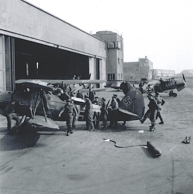 Opnames van 13.04.1945. Britse troepen verplaatsen buitgemaakte toestellen op het ingenomen vliegveld Celle. Gotha Go 145's en een Arado Ar 96 zijn te zien.